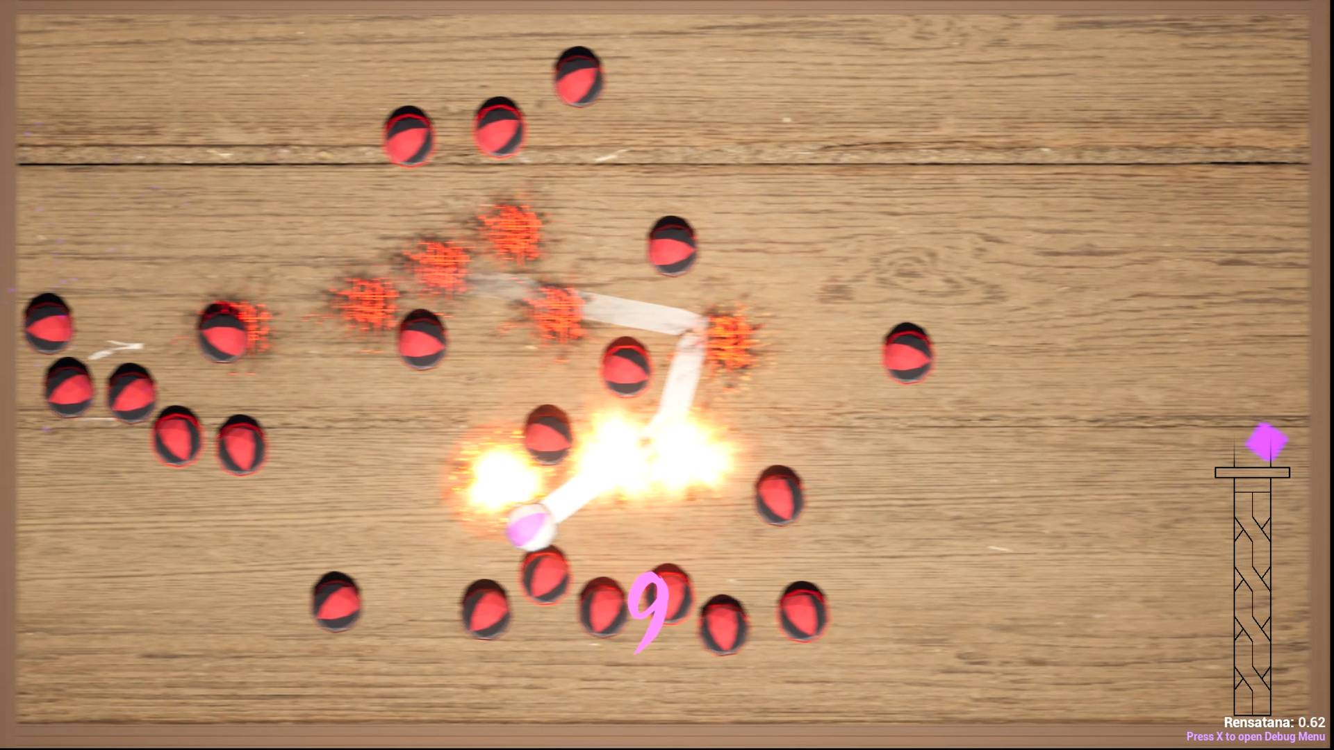 Rensatana is a top-down twin-stick "horde-clearer". You play as a ninja who has finally gotten their hands on the mythical Rensata - the Katana to chain them all. Use it to slice and dice the ninjas who seek the power you now have: To kills dozens of enemies in one fell swoop - should you be skilled enough.
